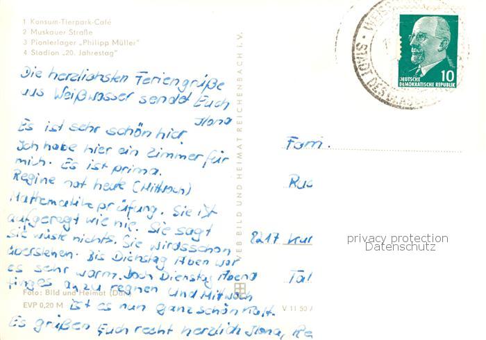 73870914 alte Postkarte Weisswasser Oberlausitz Konsum Tierpark Cafe Muskauer Strasse Pionierlager Philipp Mueller Stadion 20. Jahrestag postalisch gelaufen Erhaltung siehe scans [WerneD78] KatCode: 11110014284470