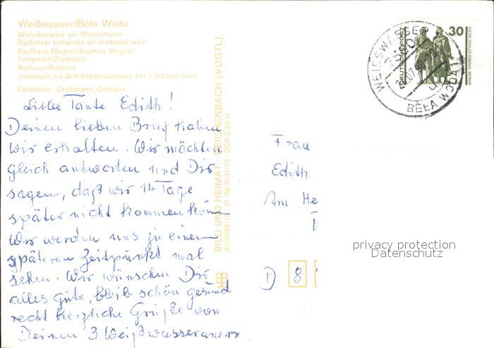 72323463 alte Postkarte Weisswasser Oberlausitz Wohnkomplex Wasserturm Kaufhaus Magnet Tiergarten Rathaus Jahnteich mit Schiffsbar postalisch gelaufen Erhaltung siehe scans KatCode: 11110014284470