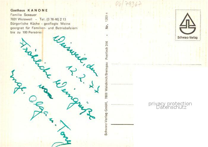 73658678 Weisweil Kaiserstuhl Gasthaus Kanone Restaurant Hausmusik postalisch nicht gelaufen Erhaltung siehe scans [FriedD77] KatCode: 11110008316049