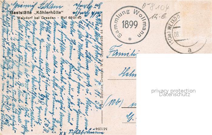 43348297 alte Postkarte Weixdorf Gaststaette Koehlerhuette postalisch gelaufen Erhaltung siehe scans [WerneD78] KatCode: 11110014262000