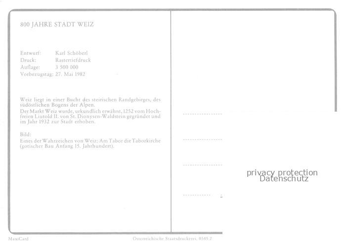 74025034 Weiz Steiermark AT 800 Jahre Stadt Weiz Wahrzeichen Taborkirche 15. Jhdt. postalisch nicht gelaufen Erhaltung siehe scans [FriedD77] KatCode: 11390224061755