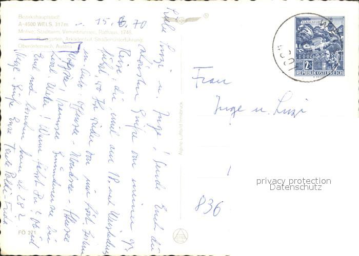 72438943 alte Postkarte Wels Stadtturm Venusbrunnen Rathaus Burggarten postalisch gelaufen Erhaltung siehe scans KatCode: 11390