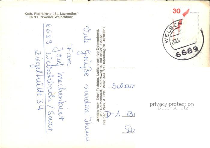 72429175 alte Postkarte Welschbach Hirzweiler Katholische Pfarrkirche St Laurentius Fliegeraufnahme postalisch gelaufen Erhaltung siehe scans KatCode: 11110010043112