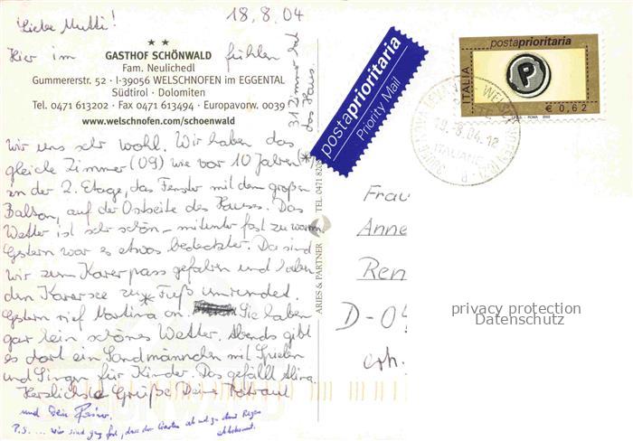 74005673 old postcard Welschnofen Suedtirol IT Gasthof Schoenwald postalisch gelaufen Erhaltung siehe scans [WerneD78] KatCode: 11240