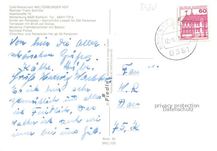 74049286 alte Postkarte Weltenburg Kelheim Ausflugsgaststaette Weltenburger Hof Kloster Donaudurchbruche postalisch gelaufen Erhaltung siehe scans [FriedD77] KatCode: 11110009273137