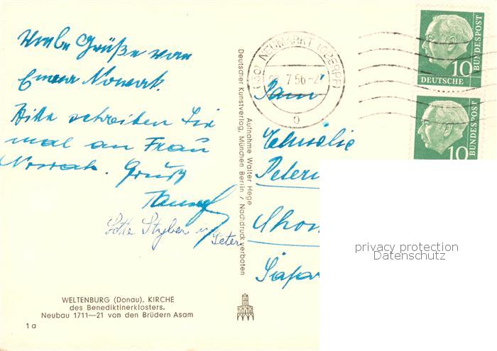 73787987 alte Postkarte Weltenburg Kelheim Kirche des Benediktinerklosters Donautal postalisch gelaufen Erhaltung siehe scans [FriedD77] KatCode: 11110009273137
