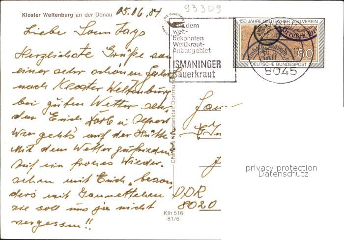 72455182 alte Postkarte Weltenburg Kelheim Kloster Donau postalisch gelaufen Erhaltung siehe scans KatCode: 11110009273137