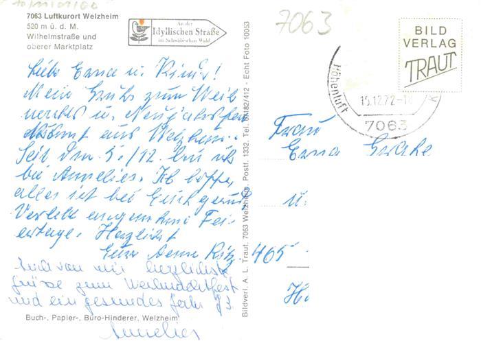 73972787 alte Postkarte Welzheim Wilhelmstrasse und oberer Marktplatz im Winter Nachtaufnahmen postalisch gelaufen Erhaltung siehe scans [FriedD77] KatCode: 11110008119084