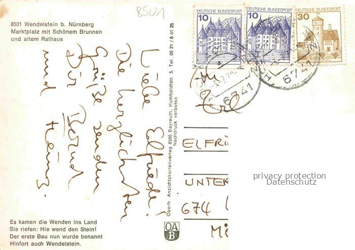 74049085 alte Postkarte Wendelstein Mittelfranken Marktplatz Schoener Brunnen altes Rathaus Fachwerkhaus postalisch gelaufen Erhaltung siehe scans [FriedD77] KatCode: 11110009576151