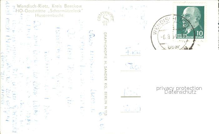 alte Postkarte Wendisch Rietz HO Gaststaette Scharmuetzeleck Husarenbucht postalisch gelaufen Erhaltung siehe scans