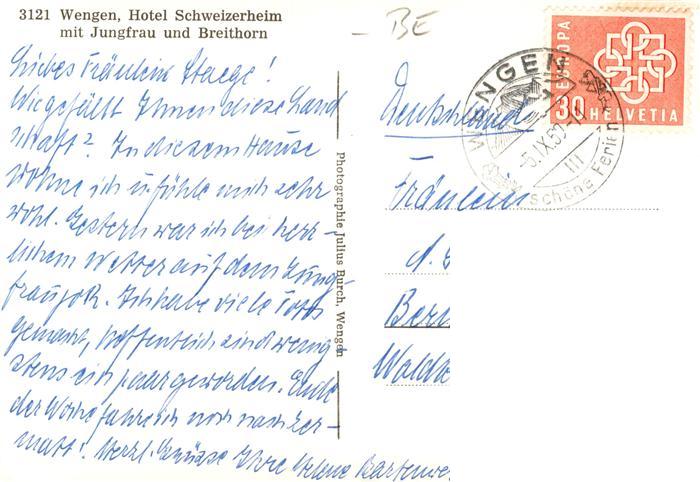 13940778 alte Postkarte Wengen BE Hotel Schweizerheim mit Jungfrau und Breithorn postalisch gelaufen Erhaltung siehe scans [WerneD78] KatCode: 11470060175274