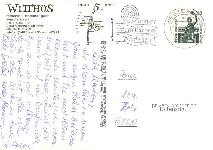 73224573 alte Postkarte Wenningstedt Sylt Restaurant Teestube Galerie Witthues postalisch gelaufen Erhaltung siehe scans [KathaD81] KatCode: 11110001054149