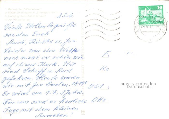 72424103 alte Postkarte Werbellinsee-Altenhof Badestelle und Campingplatz Suesser Winkel FDGB Erholungsheim Strandpavillon Werbellinsee postalisch gelaufen Erhaltung siehe scans KatCode: 11110012060198