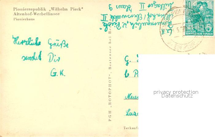43352408 alte Postkarte Werbellinsee-Altenhof Pionierrepublik Wilhelm Pieck Pionierhaus postalisch gelaufen Erhaltung siehe scans [WerneD78] KatCode: 11110012060198