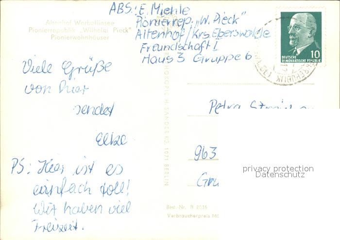 72477131 alte Postkarte Werbellinsee-Altenhof Pionierwohnhaeuser postalisch gelaufen Erhaltung siehe scans KatCode: 11110012060198