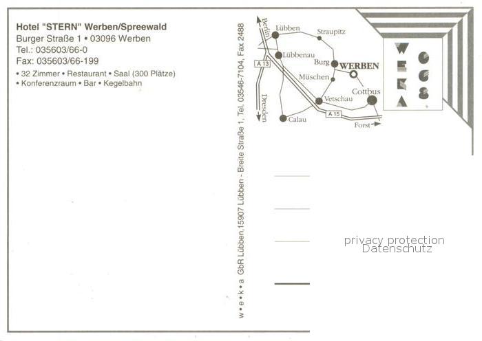 73642445 Werben Niederlausitz Hotel Stern Restaurant Kahnfahrt im Spreewald postalisch nicht gelaufen Erhaltung siehe scans [WerneD78] KatCode: 11110012071412