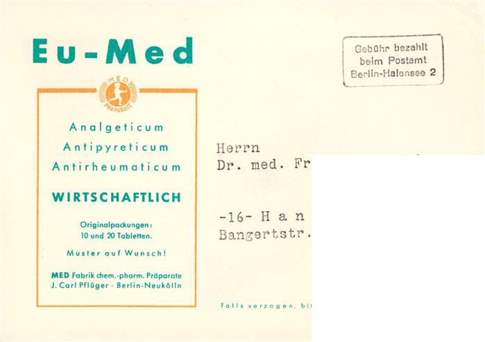 73948181 Werbung Reklame Eu-Med Wirtschaftlich Analgeticum Berlin postalisch nicht gelaufen Erhaltung siehe scans [SanaeD93] KatCode: 22060000008200