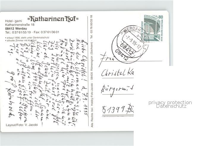72473300 alte Postkarte Werdau Sachsen Katharinen-Hof Hotel postalisch gelaufen Erhaltung siehe scans KatCode: 11110014193490