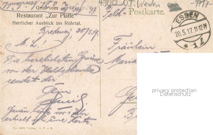 73692837 alte Postkarte Werden Ruhr Essen Blick zum Pastoratsberg Restaurant Zur Plate Uferpartie an der Ruhr Feldpost postalisch gelaufen Erhaltung siehe scans [FriedD77] KatCode: 11110005113000