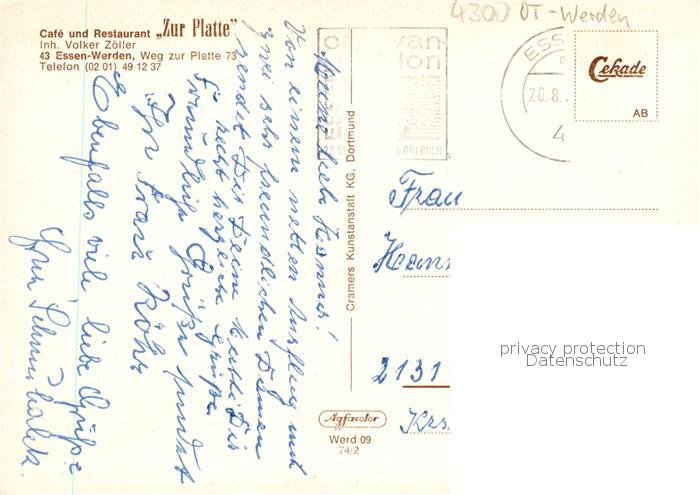 73870167 alte Postkarte Werden Ruhr Essen Cafe und Restaurant Zur Platte Gastraeume Terrasse postalisch gelaufen Erhaltung siehe scans [WerneD78] KatCode: 11110005113000