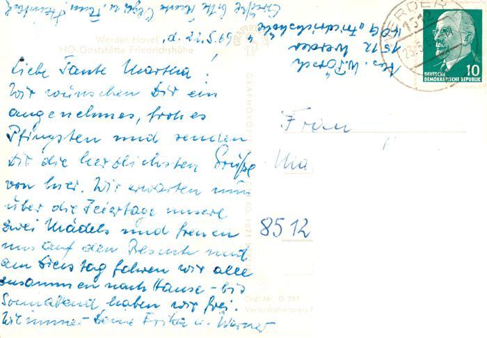 73900838 alte Postkarte Werder Havel HO Gaststaette Friedrichshoehe postalisch gelaufen Erhaltung siehe scans [FriedD77] KatCode: 11110012069656