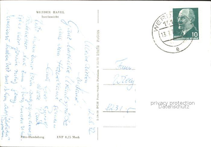 72077392 alte Postkarte Werder Havel Inselansicht Kirche Windmuehle Schwaene postalisch gelaufen Erhaltung siehe scans KatCode: 11110012069656