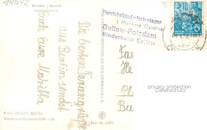 73044779 alte Postkarte Werder Havel Muehlenblick postalisch gelaufen Erhaltung siehe scans [PaolaD17] KatCode: 11110012069656