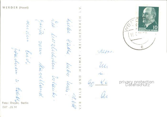 72337018 alte Postkarte Werder Havel Partie am Fluss Kirche Windmuehle postalisch gelaufen Erhaltung siehe scans KatCode: 11110012069656