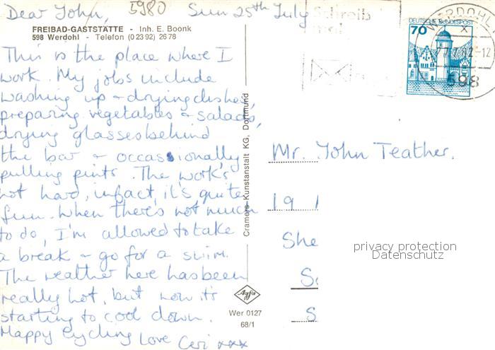 73854197 alte Postkarte Werdohl Freibad Gaststaette Gaststube Terrasse postalisch gelaufen Erhaltung siehe scans [WerneD78] KatCode: 11110005962060