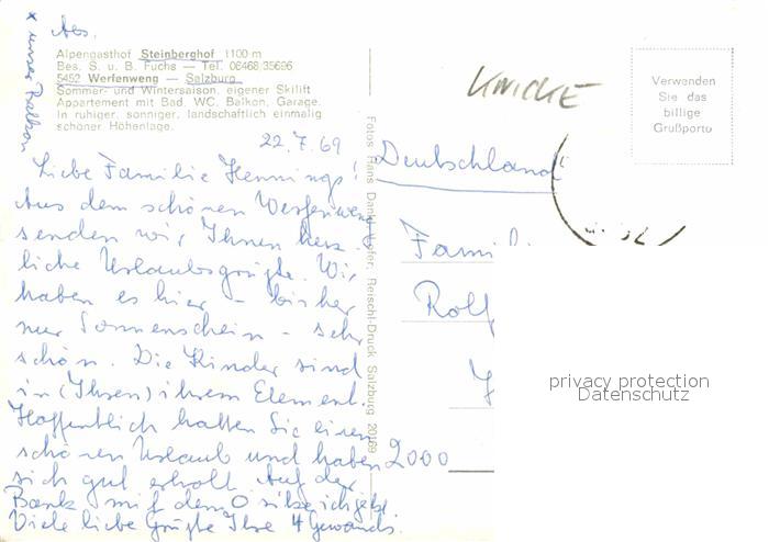 72707094 alte Postkarte Werfenweng Alpengasthof Steinberghof postalisch gelaufen Erhaltung siehe scans [WerneD78] KatCode: 11390322050425