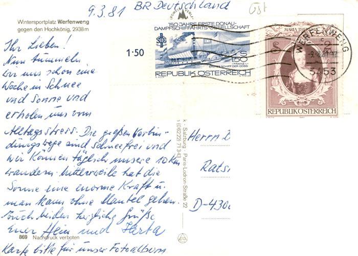 73923276 alte Postkarte Werfenweng AT mit Hochkoenig postalisch gelaufen Erhaltung siehe scans [FriedD77] KatCode: 11390322050425