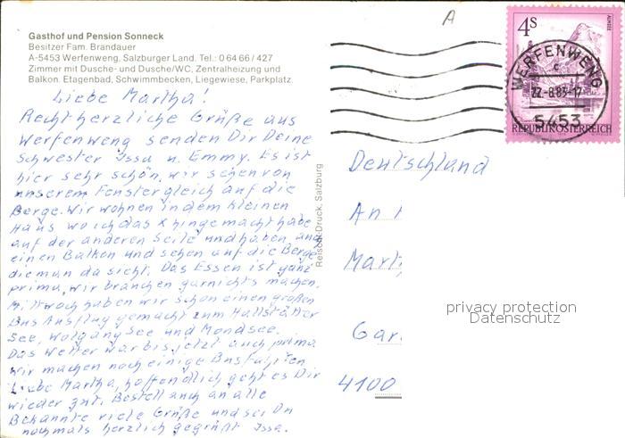 72603527 alte Postkarte Werfenweng Gasthof Pension Sonneck Terrasse Alpenblick postalisch gelaufen Erhaltung siehe scans [FriedD77] KatCode: 11390322050425