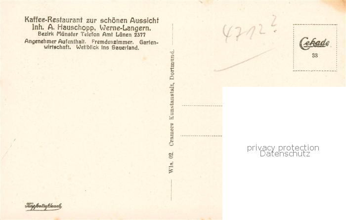 73792375 Werne-Langern Unna Restaurant-Kaffee Zur schoenen Aussicht – Schloss Cappenberg – Schloss Buddenberg – Duesterbachtal postalisch nicht gelaufen Erhaltung siehe scans [LiesaD40] KatCode: 11110005978040