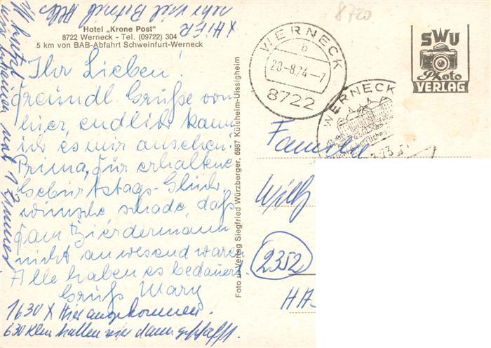 73915050 alte Postkarte Werneck Hotel Krone Post Gaststube Ortspartie postalisch gelaufen Erhaltung siehe scans [FriedD77] KatCode: 11110009678193