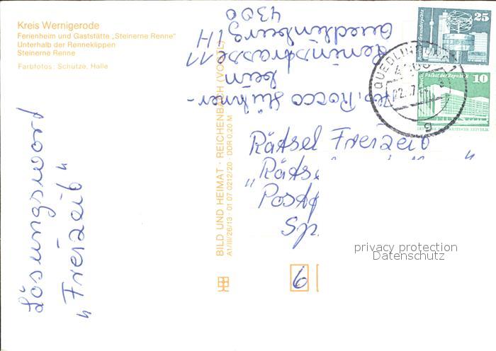 72401264 alte Postkarte Wernigerode Harz An der Steinernen Renne Ferienheim Gaststaette Rennekippe postalisch gelaufen Erhaltung siehe scans KatCode: 11110015085370