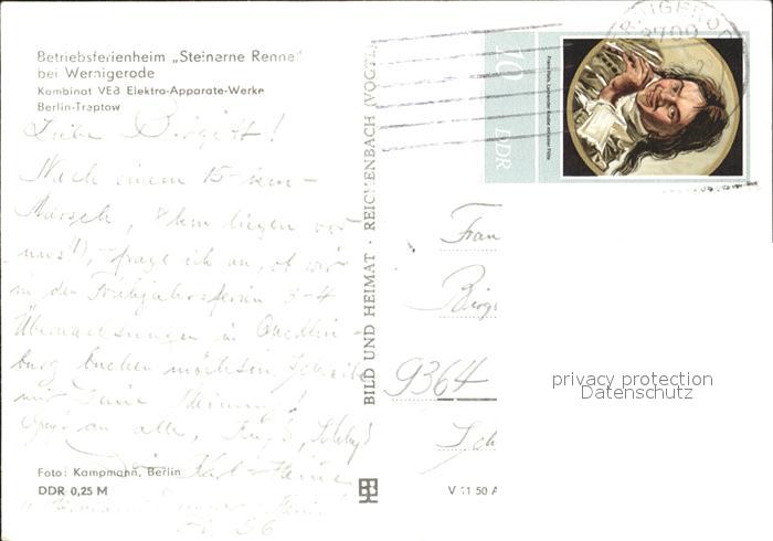 72341963 alte Postkarte Wernigerode Harz Betriebsferienheim Steinerne Renne postalisch gelaufen Erhaltung siehe scans KatCode: 11110015085370