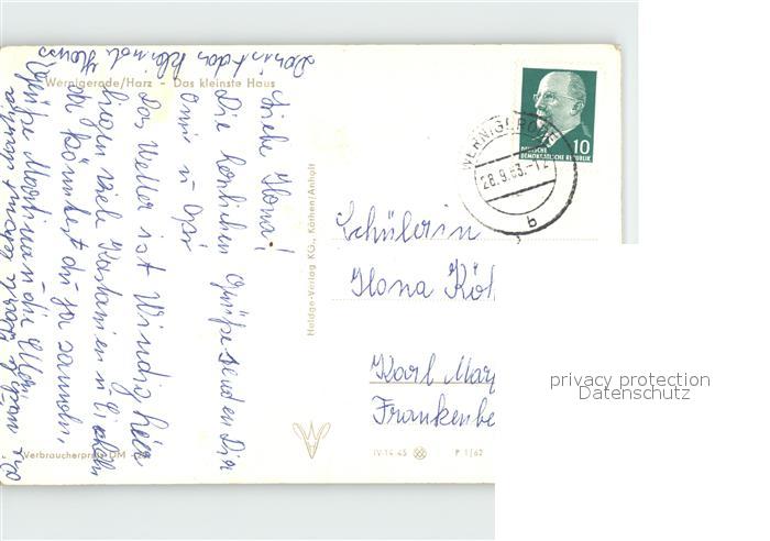 72384044 alte Postkarte Wernigerode Harz Das kleinste Haus postalisch gelaufen Erhaltung siehe scans KatCode: 11110015085370