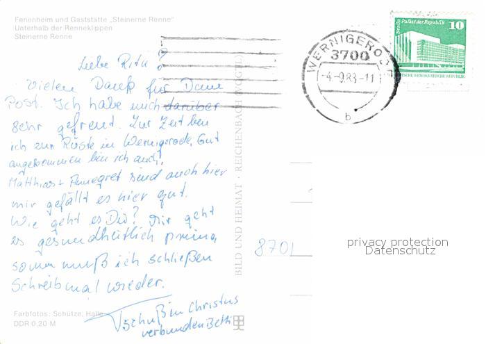 72848885 alte Postkarte Wernigerode Harz Ferienheim Gaststaette Steinerne Renne Renneklippen postalisch gelaufen Erhaltung siehe scans [FriedD77] KatCode: 11110015085370