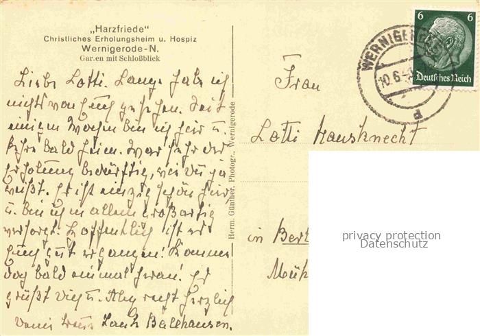 74025289 alte Postkarte Wernigerode Harz Harzfriede Christl Erholungsheim und Hospiz Garten Schlossblick postalisch gelaufen Erhaltung siehe scans [WerneD78] KatCode: 11110015085370