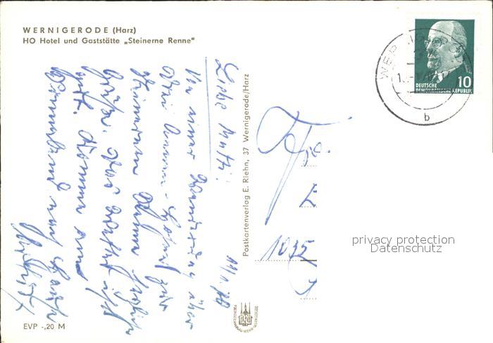 72177708 alte Postkarte Wernigerode Harz HO Hotel Gaststaette Steinerne Renne postalisch gelaufen Erhaltung siehe scans KatCode: 11110015085370