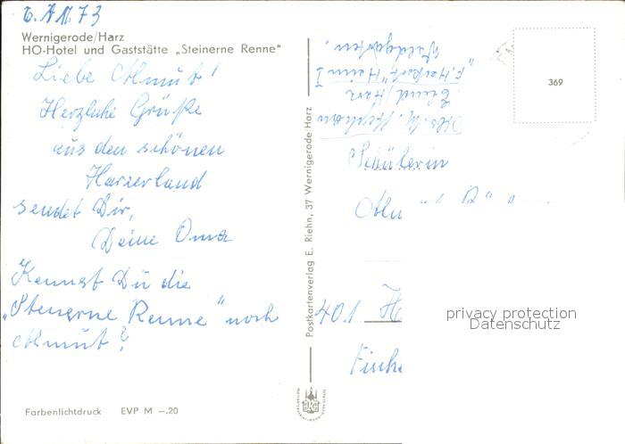 72533543 alte Postkarte Wernigerode Harz HO Hotel Steinerne Renne postalisch gelaufen Erhaltung siehe scans [WerneD78 kt116box] KatCode: 11110015085370