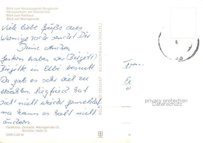 73040924 alte Postkarte Wernigerode Harz Neubaugebiet Burgbreite Harzquerbahn Westerntor Rathaus postalisch gelaufen Erhaltung siehe scans [FriedD77] KatCode: 11110015085370