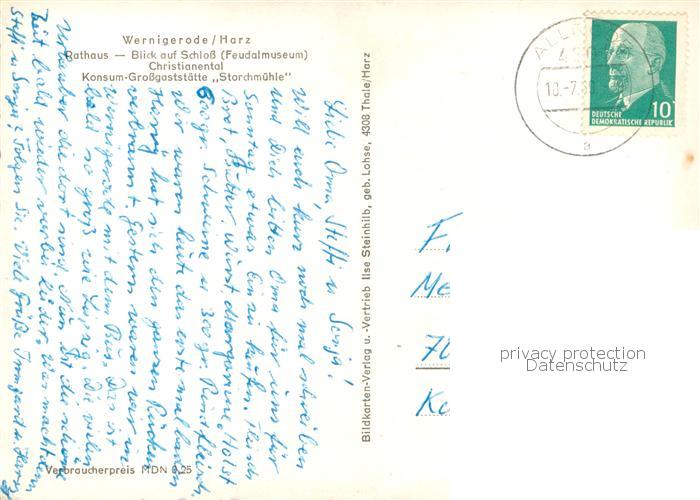 73757021 alte Postkarte Wernigerode Harz Rathaus Schlossblick Feudalmuseum Christianental Konsum Gaststaette Storchmuehle postalisch gelaufen Erhaltung siehe scans [WerneD78] KatCode: 11110015085370