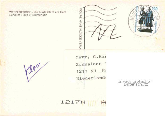 72772790 alte Postkarte Wernigerode Harz Schiefes Haus mit Blumenuhr postalisch gelaufen Erhaltung siehe scans [WerneD78] KatCode: 11110015085370