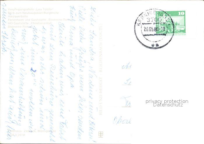 72366976 alte Postkarte Wernigerode Harz Verpflegungsstelle Leo Tolstoi Neubaugebiet Burgbreite Harzquerbahn Ferienheim HO Gaststaette Steinerne Renne postalisch gelaufen Erhaltung siehe scans KatCode: 11110015085370