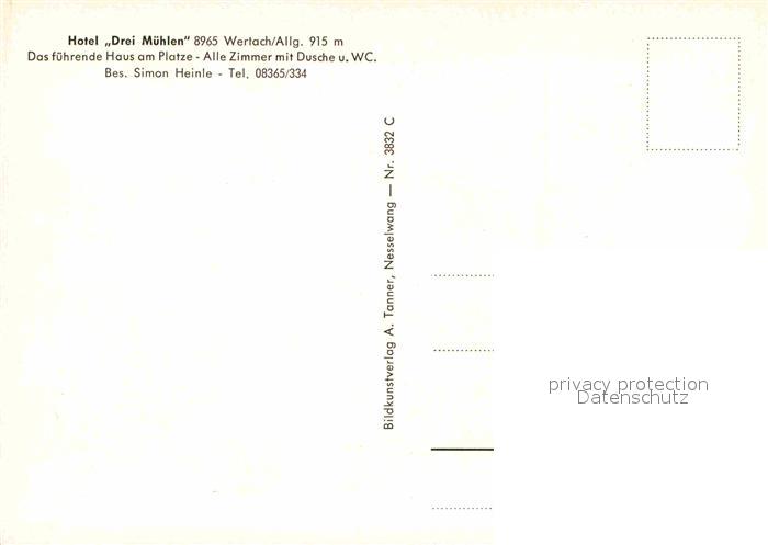 72728937 Wertach Hotel Drei Muehlen postalisch nicht gelaufen Erhaltung siehe scans [AndreD76] KatCode: 11110009780145