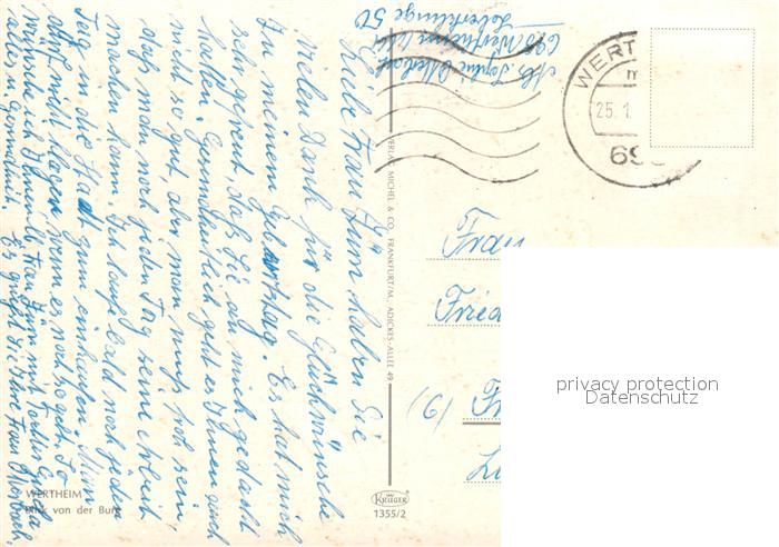 73122312 alte Postkarte Wertheim Main Blick von der Burg postalisch gelaufen Erhaltung siehe scans [KathaD81] KatCode: 11110008128131