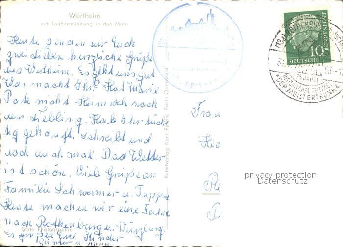 72395541 alte Postkarte Wertheim Main Fliegeraufnahme mit Taubermuendung postalisch gelaufen Erhaltung siehe scans KatCode: 11110008128131