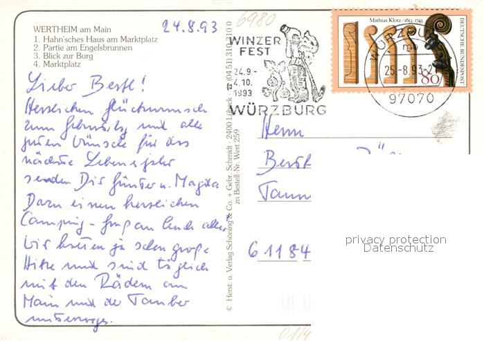 73181481 alte Postkarte Wertheim Main Hahnsches Haus am Marktplatz Engelsbrunnen Burgblick Marktplatz postalisch gelaufen Erhaltung siehe scans [WerneD78] KatCode: 11110008128131