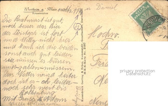 72093374 alte Postkarte Wertheim Main Kitzsteintor postalisch gelaufen Erhaltung siehe scans KatCode: 11110008128131
